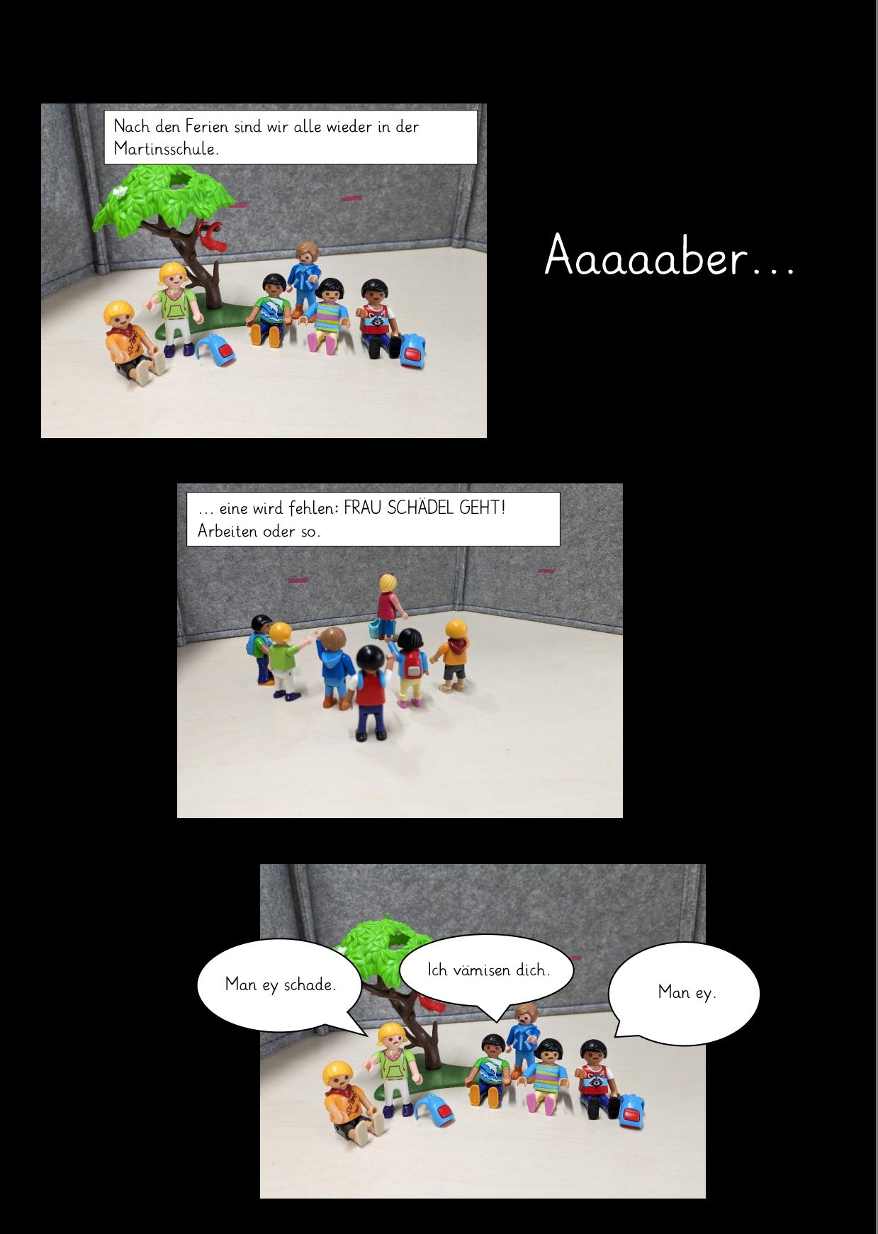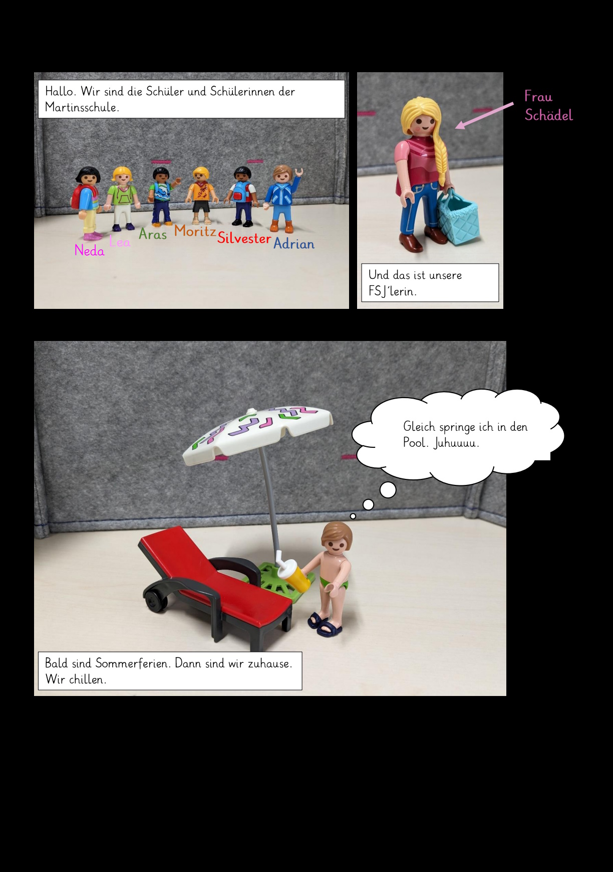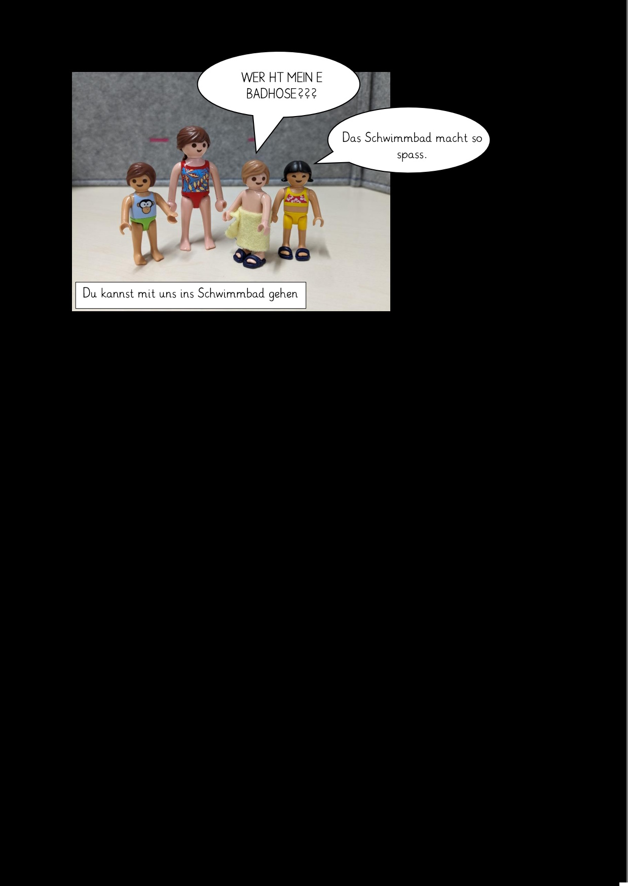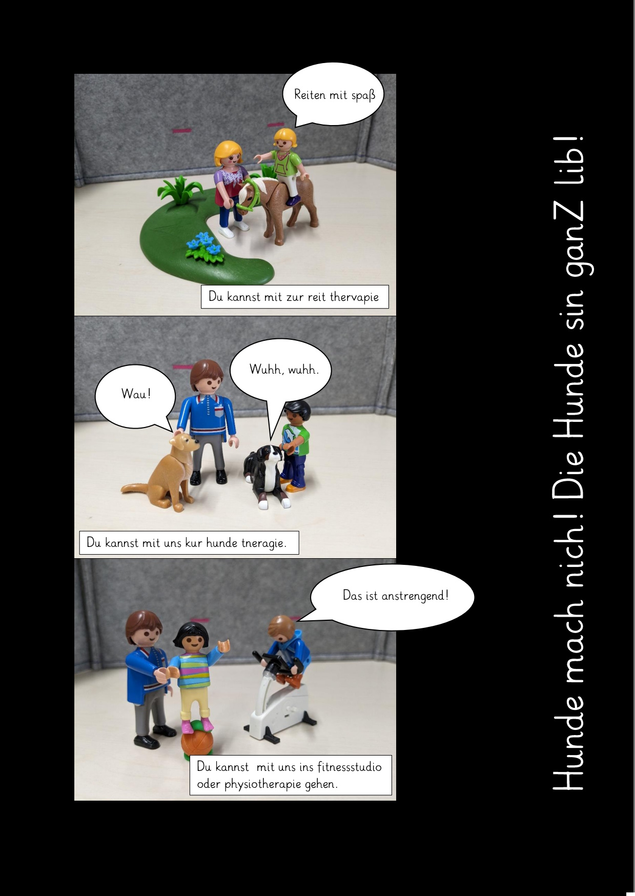 Wir haben einen Comic geschrieben. Erst haben wir uns eine Geschichte ausgedacht. Dann haben wir mit Playmobil die Szenen hingestellt. Das haben wir fotografiert mit dem Ipad. Dann haben wir den Text geschrieben auf dem Computer. Dann haben wir die Sprechblasen und Gedankenblasen geschrieben.