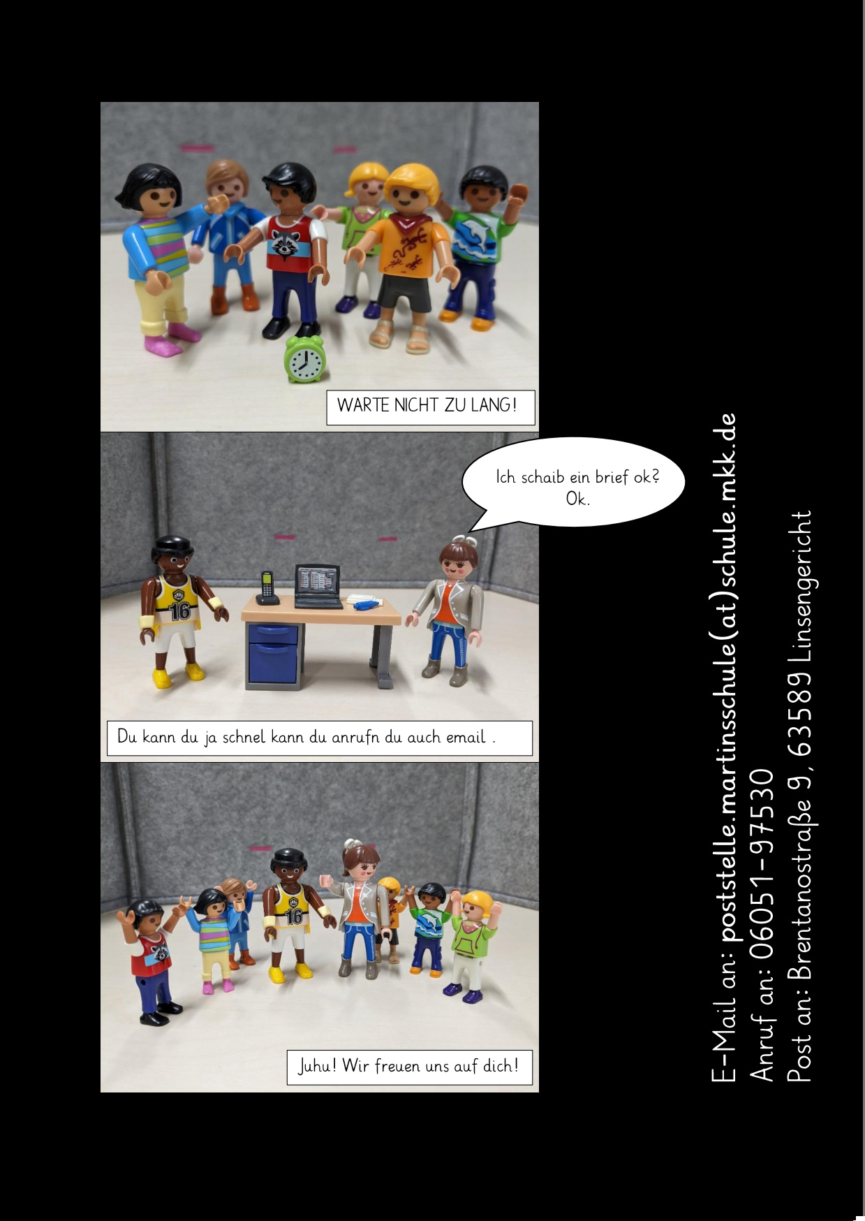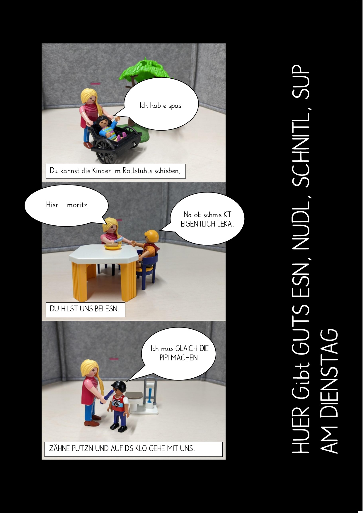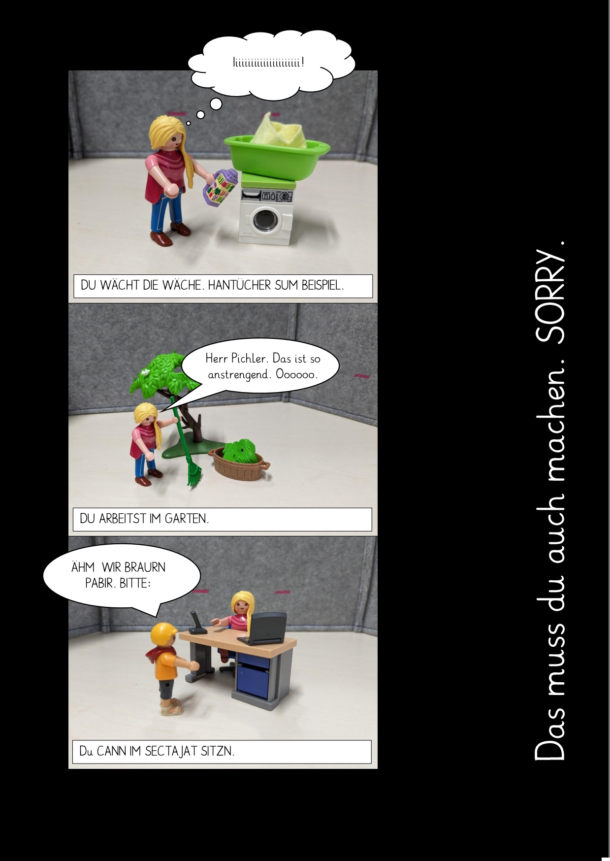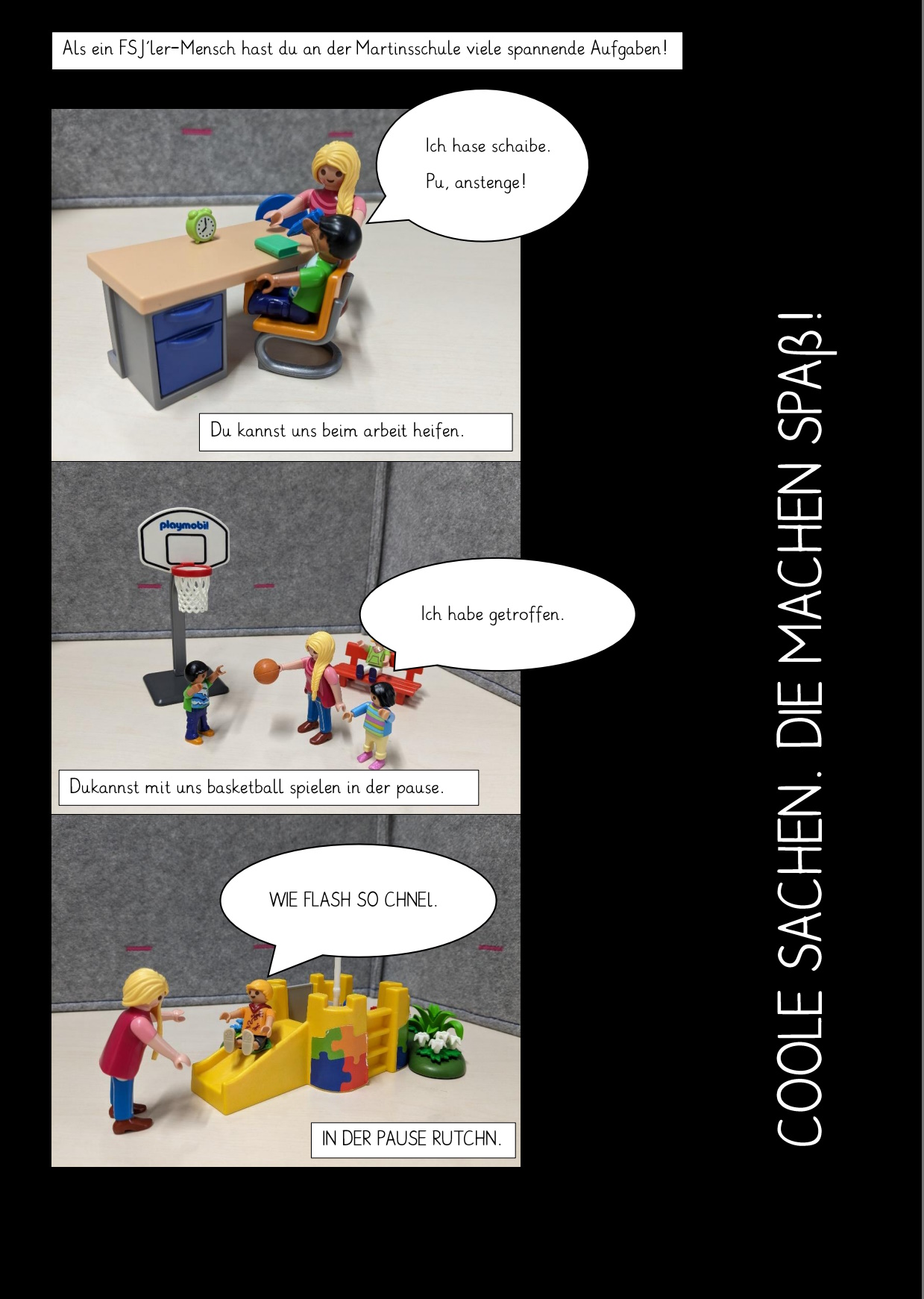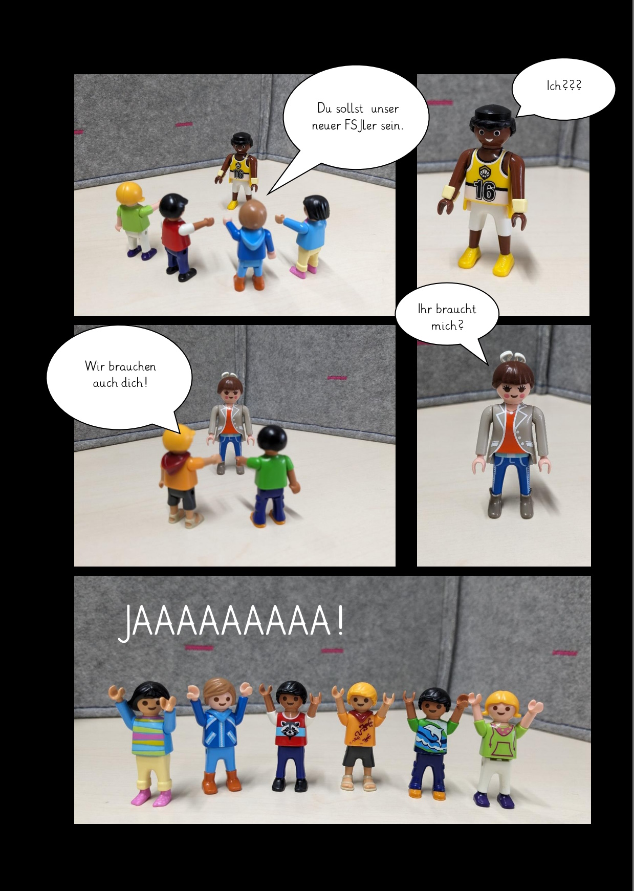 Wir haben einen Comic geschrieben. Erst haben wir uns eine Geschichte ausgedacht. Dann haben wir mit Playmobil die Szenen hingestellt. Das haben wir fotografiert mit dem Ipad. Dann haben wir den Text geschrieben auf dem Computer. Dann haben wir die Sprechblasen und Gedankenblasen geschrieben.